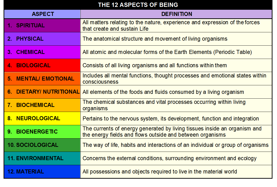 The 12 Aspects of Being provide a clear way of communicating all the possible factors that influence our ability to change and grow. They also give us the ability to determine all possible causes of dis-eases. We can then be exact with our diagnoses and treatment. We will be able to determine everything required at each stage and phase of healing, even for the most complex states and conditions.
